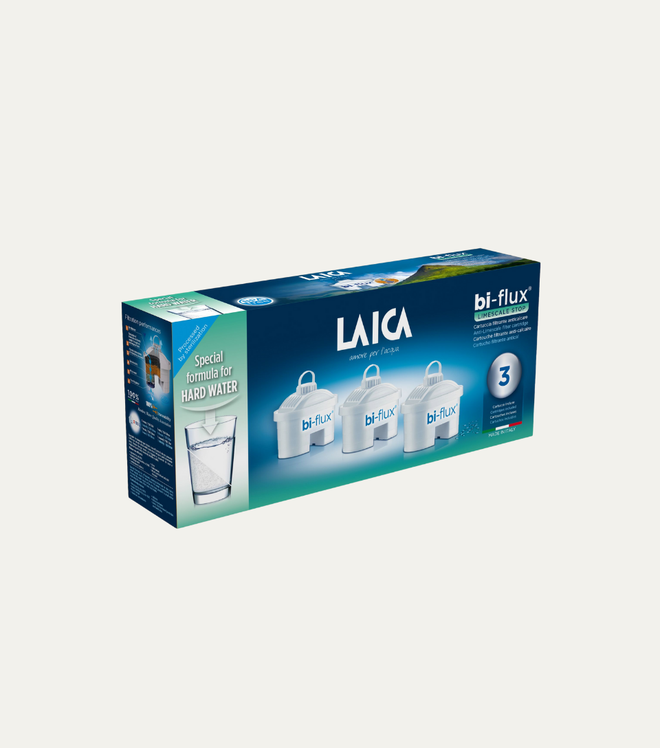 LAICA bi-flux® Limescale Stop är utvecklat särskilt för områden med hårt vatten. Filtret har ett extra fokus på att reducera kalk, samtidigt som smak och vattenkvalitet förbättras. Detta 3-pack är ett bra val för dig som vill ha mer balanserat vatten och mindre kalk i både dricksvatten och hushåll.